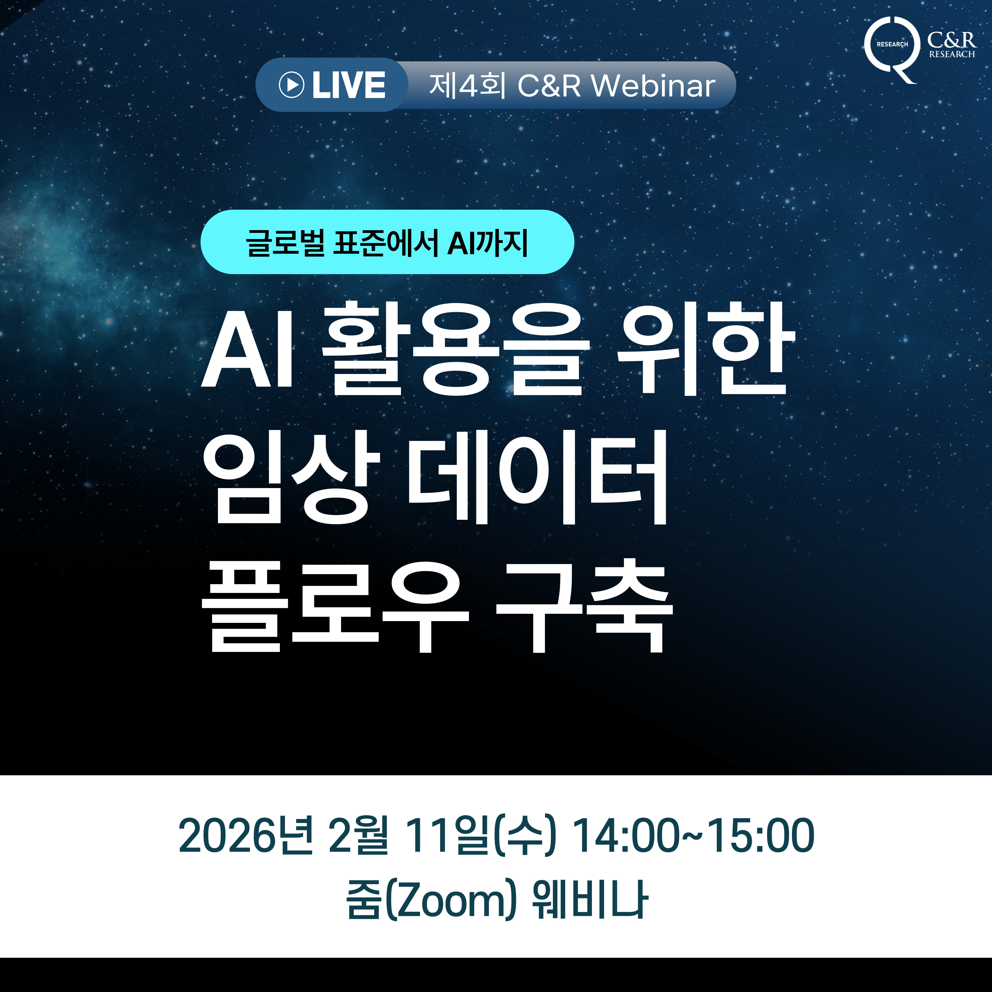 다가오는 2월 11일, 씨엔알리서치의 네번째 웨비나를 개최합니다! ‘글로벌 표준에서 AI까지: AI 활용을 위한 임상 데이터 플로우 구축’을 주제로 임상시험 데이터의 디지털 전환과 AI 활용 전략을 살펴봅니다. 씨엔알리서치 Platform 주혜경 파트장과 트라이얼인포매틱스 TDH 조영철 팀장과 함께임상시험 데이터 표준화와 AI 활용에 대한 최신 인사이트를 공유할 예정입니다.이번 웨비나는 운영상의 사유로 초청 대상자에 한해 비공개로 진행되는 점 안내드립니다.다음 웨비나에서는 보다 좋은 기회로 찾아뵐 수 있도록 준비하겠습니다. * [세션 1]✔ 주제: Enable seamless data flow with CDISC standards✔ 연사: 씨엔알리서치 Platform 주혜경 파트장[세션 2]✔ 주제: Beyond data flow: AI-driven real-time analytics and clinical insights✔ 연사: 트라이얼인포매틱스 TDH 조영철 팀장