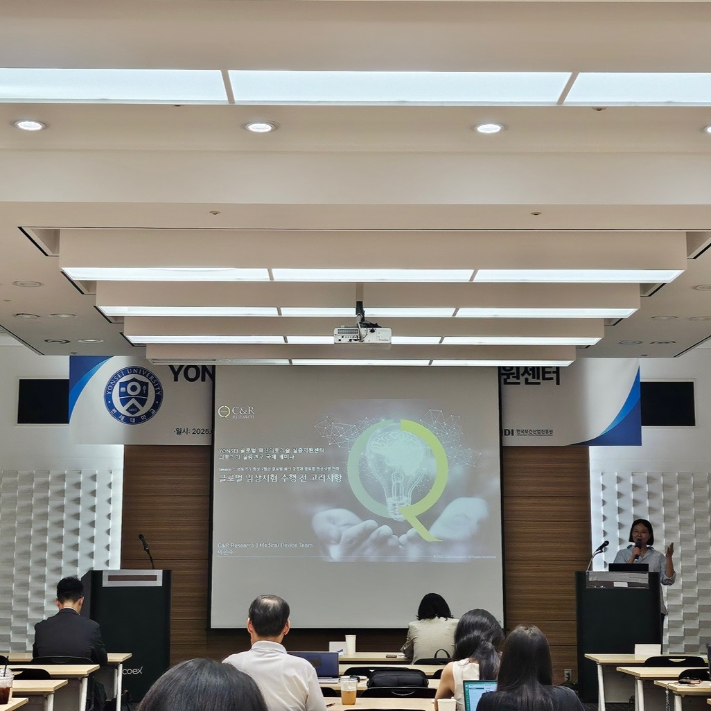 2025-09-24씨엔알리서치가 YONSEI 글로벌 혁신의료기술 실증지원센터 의료기기 실증연구 국제 세미나에 참여하였습니다. Session 2에서 ‘글로벌 임상시험 수행 전 고려사항’의 주제로 씨엔알리서치 의료기기팀 이은주 팀장의 발표 세션이 진행되었습니다. 세미나의 오전 시간을 통해 의료기기 분양의 국내외 규제 및 실증 관련 동향을 파악하고,오후에는 사례를 통해 글로벌 임상시험 수행 전 고려사항을 확인할 수 있어 뜻깊은 시간이었습니다. 세미나 일정에 참석해 주신 모든 분들과성공적으로 행사를 개최할 수 있도록 도움 주신 모든 분들께 진심으로 감사드립니다.