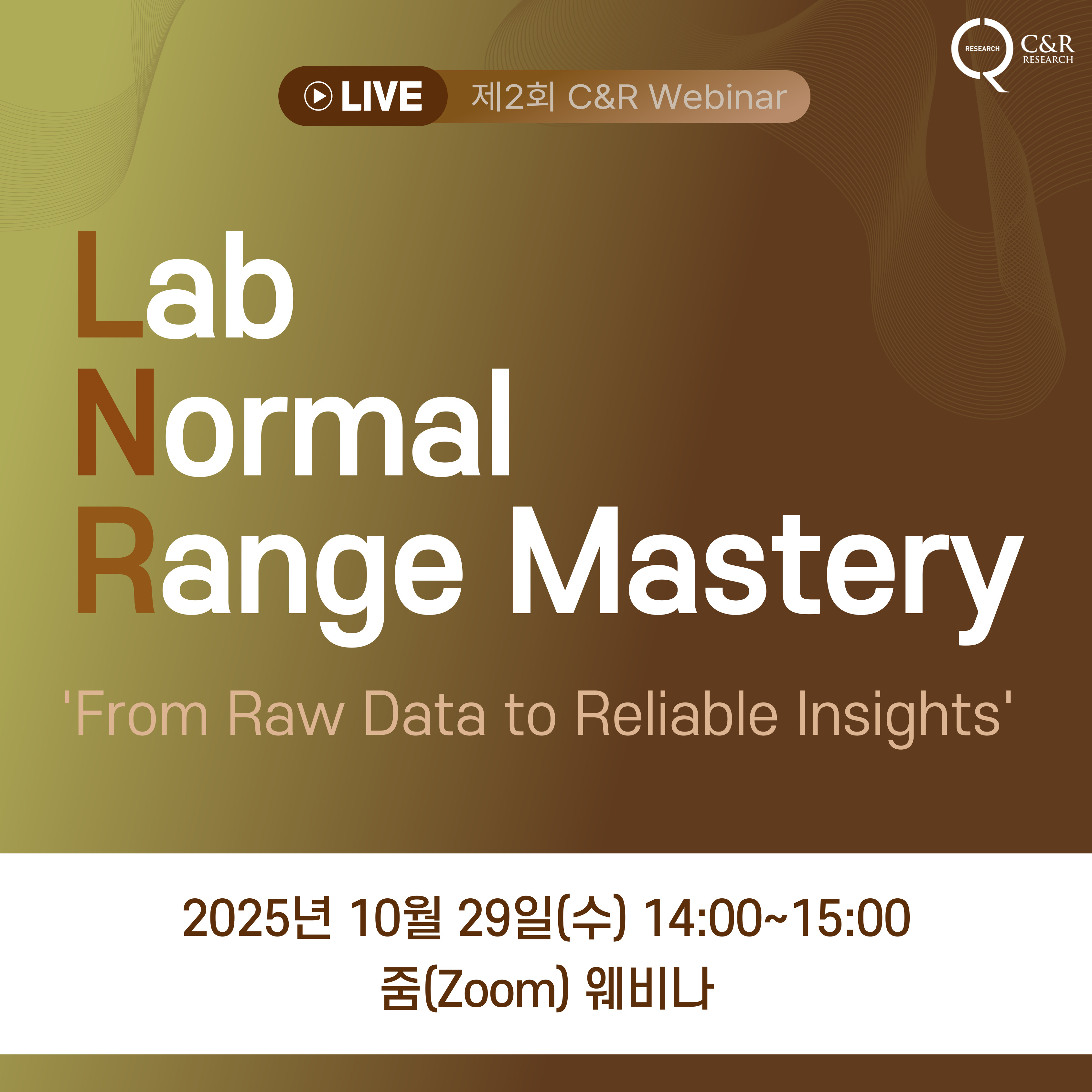 2025-09-29⭐ 웨비나 사전 등록 바로가기 (클릭) ⭐ * 다가오는 10월 29일, 씨엔알리서치의 두번째 웨비나에 여러분을 초대합니다! ‘LNR(Lab Normal Range) Mastery: From Raw Data to Reliable Insights’ 주제로 올바른 Lab 데이터 수집 및 적용을 위한 통합 가이드를 심도 있게 조명하는 뜻깊은 자리를 마련했습니다. 씨엔알리서치 DM팀의 하헌철 1팀장님, 김진석 3팀장님과 함께LNR의 통합 가이드와 임상 데이터 관리 전략에 대한 이해를 한층 더 넓히는 기회가 되시기를 바랍니다. 웨비나는 두 가지 세션으로 구성되어 진행됩니다. * [세션 1]✔ 주제: Collect it Right: Error Prevention in Lab Normal Range Collection✔ 연사: 씨엔알리서치 Data Management 하헌철 1팀장 [세션 2]✔ 주제: Beyond Collection: Quality Management & Regulatory Alignment✔ 연사: 씨엔알리서치 Data Management 김진석 3팀장